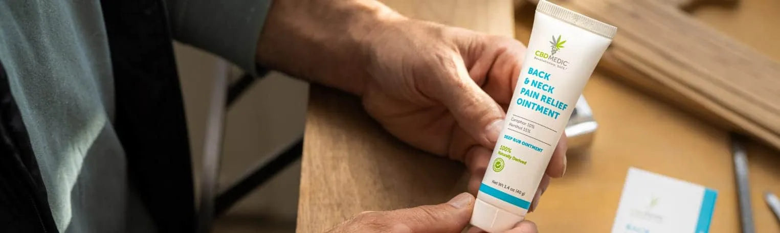 Older hands holding Charlotte's Web Back & Neck Pain Relief Ointment.