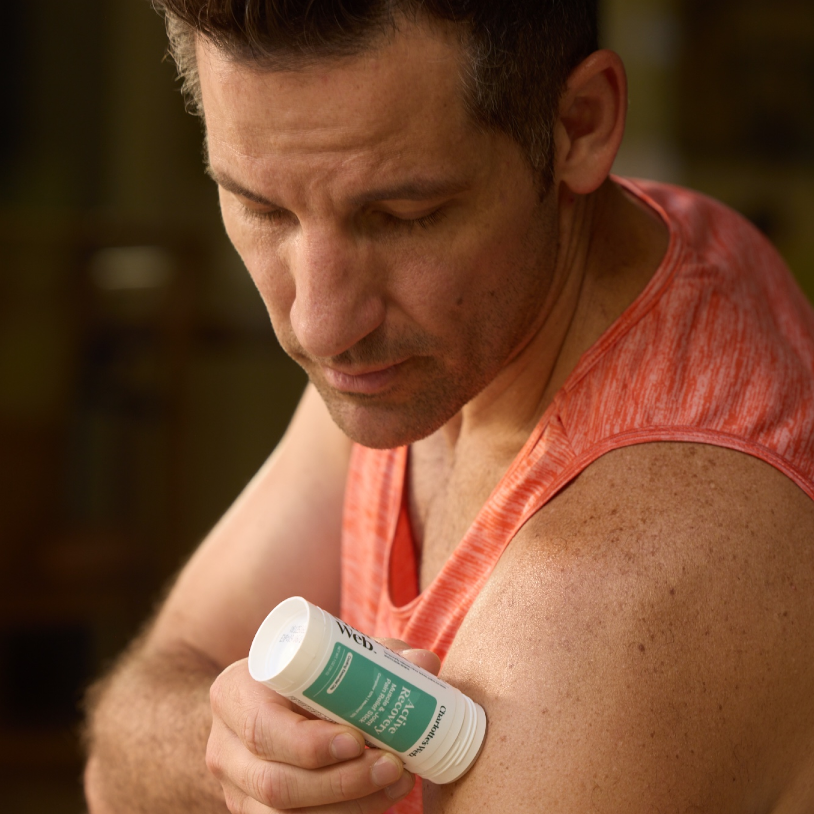 Red water bottle and Active Recovery Muscle & Joint Pain Relief Stick in a green gym bag